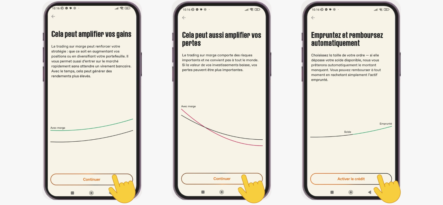 Vous détenez des actifs sur votre compte et vous êtes optimistes sur le long terme. Vous avez besoin de liquidité pour investir ou pour tous autres achats. Empruntez des euros et gardez vos positions qui bénéficieront toujours des rendements proposés par la plateforme et bien entendu des hausses (comme des baisses) du marché.