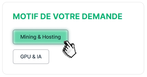 Pour ce faire, il vous faudra passer par le service client. L’équipe de vente saura vous accompagner dans la démarche. Il vous suffit de remplir le formulaire de prise de contact « Mining & Hosting ».