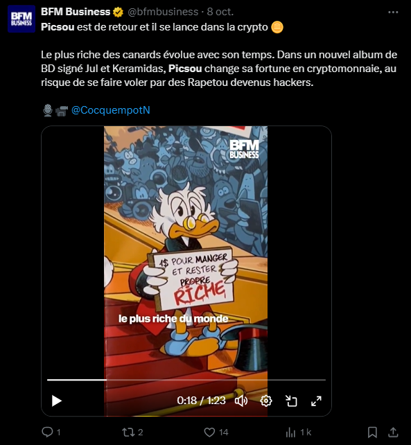 Après les Simpson ou encore South Park, deux séries américaines internationalement connues qui ont aussi abordé le thème de la crypto ou de Bitcoin, cela fait plaisir de voir les Français s’approprier aussi cette thématique. Si vous cherchez une idée originale à mettre sous le sapin de vos neveux ou de votre oncle (peut-être pas aussi fortuné que Picsou) voici une idée originale et à petit prix.