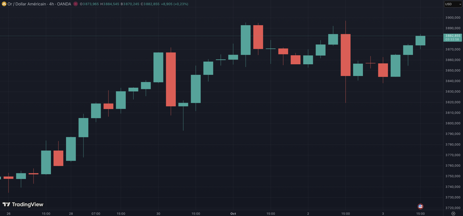 En effet, son cours (XAU – une once) a enregistré une hésitation significative sur la journée du 2 octobre, lors du déclenchement officiel du shutdown. Et c’est désormais la stagnation qui semble s’imposer sur le niveau de son tout dernier records fixé aux alentours des 3897 dollars.