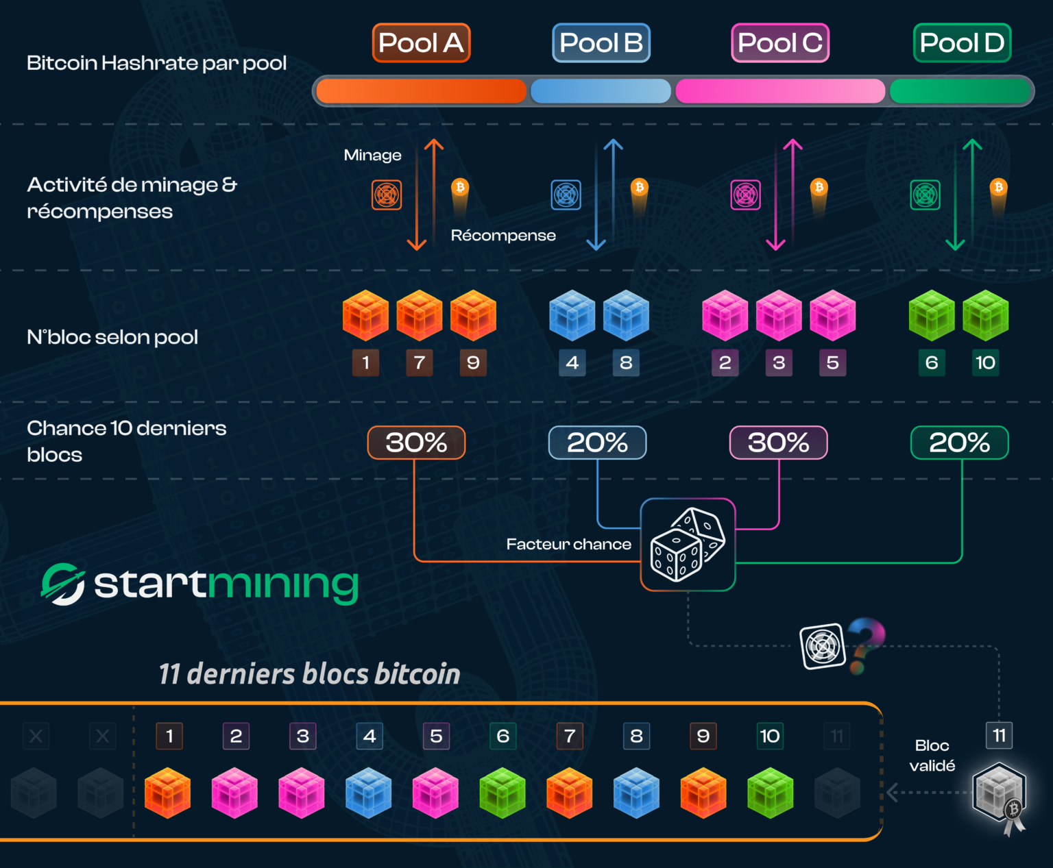 Dans un pool de minage les ressources informatiques sont mises en commun afin d’augmenter les probabilité de miner un bloc. Les récompenses sont ensuite distribuées proportionnellement en fonction du hashrate fourni par chaque mineur.