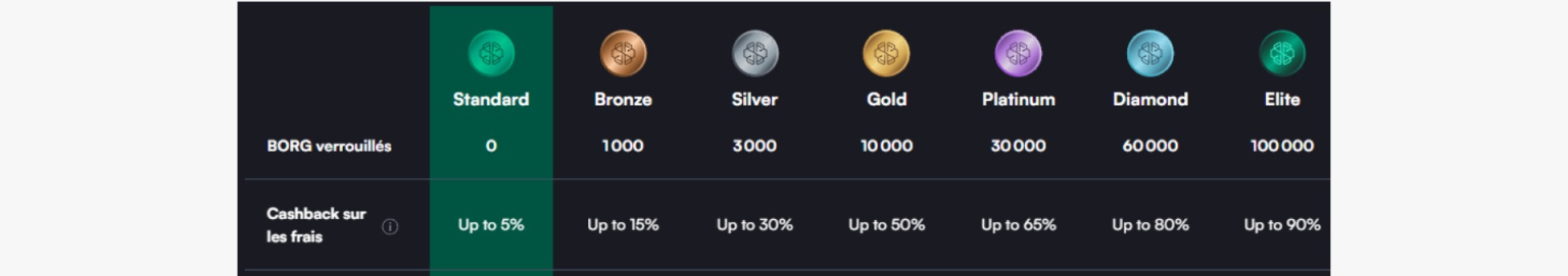 Lorsque vous effectuez un achat en crypto, la transaction crypto vers fiat génère des frais. Tout comme un swap sur l’application, obtenez jusqu’à 90% de cashback sur les frais dépensés en fonction de votre niveau de fidélité.