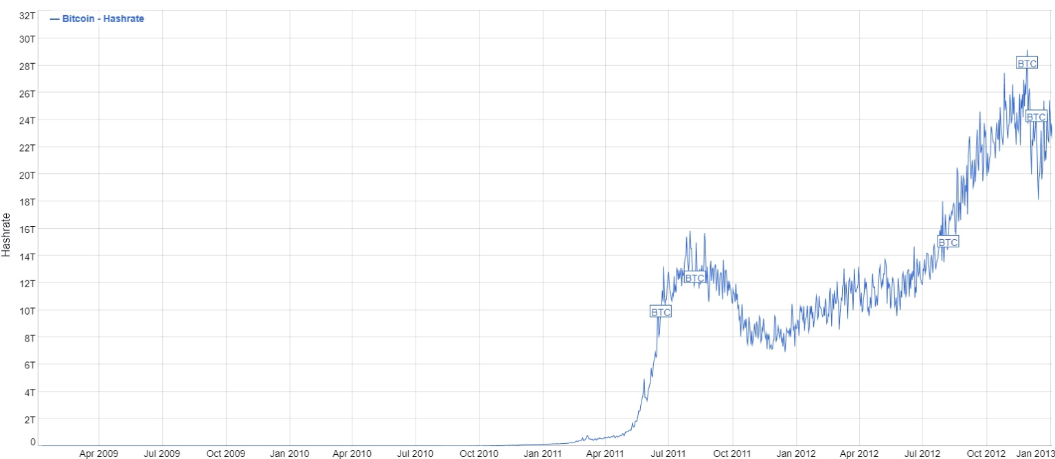 2011, c’est le début du minage à l’aide des cartes graphiques (GPU), qui mène à une montée du hashrate.