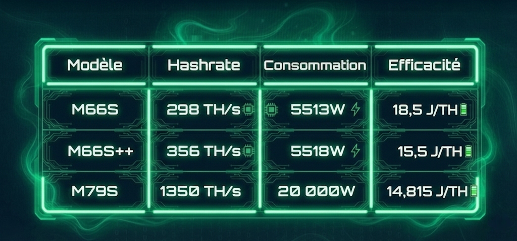 Leurs machines phares depuis la fin 2023 a été la série M66 (M66S, M66S+ & M66S++). Plus récemment le modèle M79S a prouvé être idéal pour les fermes à plus grande échelle avec un hashrate impressionnant et une efficacité maximale (et la technologie de refroidissement hydro).