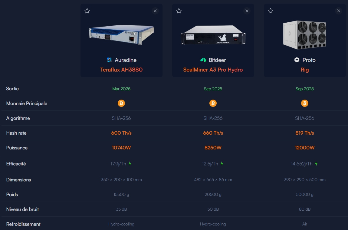 Les solutions favorisant la souveraineté et l’éthique de Auradine et Proto (Block). et Finalement, le chef de file en termes d’efficacité pure, Bitmain et son Antminer.