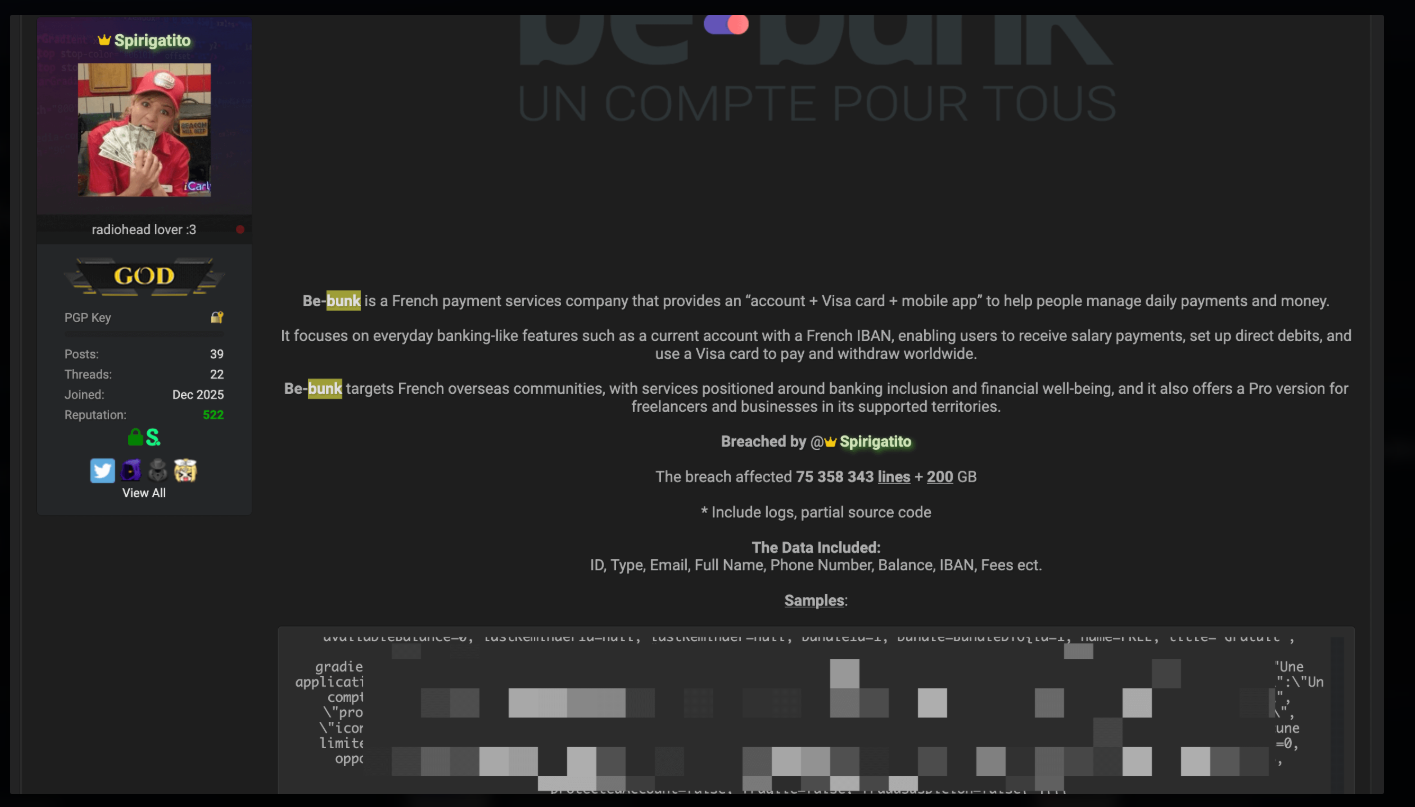 Dans le détail, le piratage revendiqué par le ou les auteurs sur des forums spécialisés porterait sur 75 millions de lignes de code, représentant la quantité spectaculaire de 200 Go de données personnelles et bancaires.