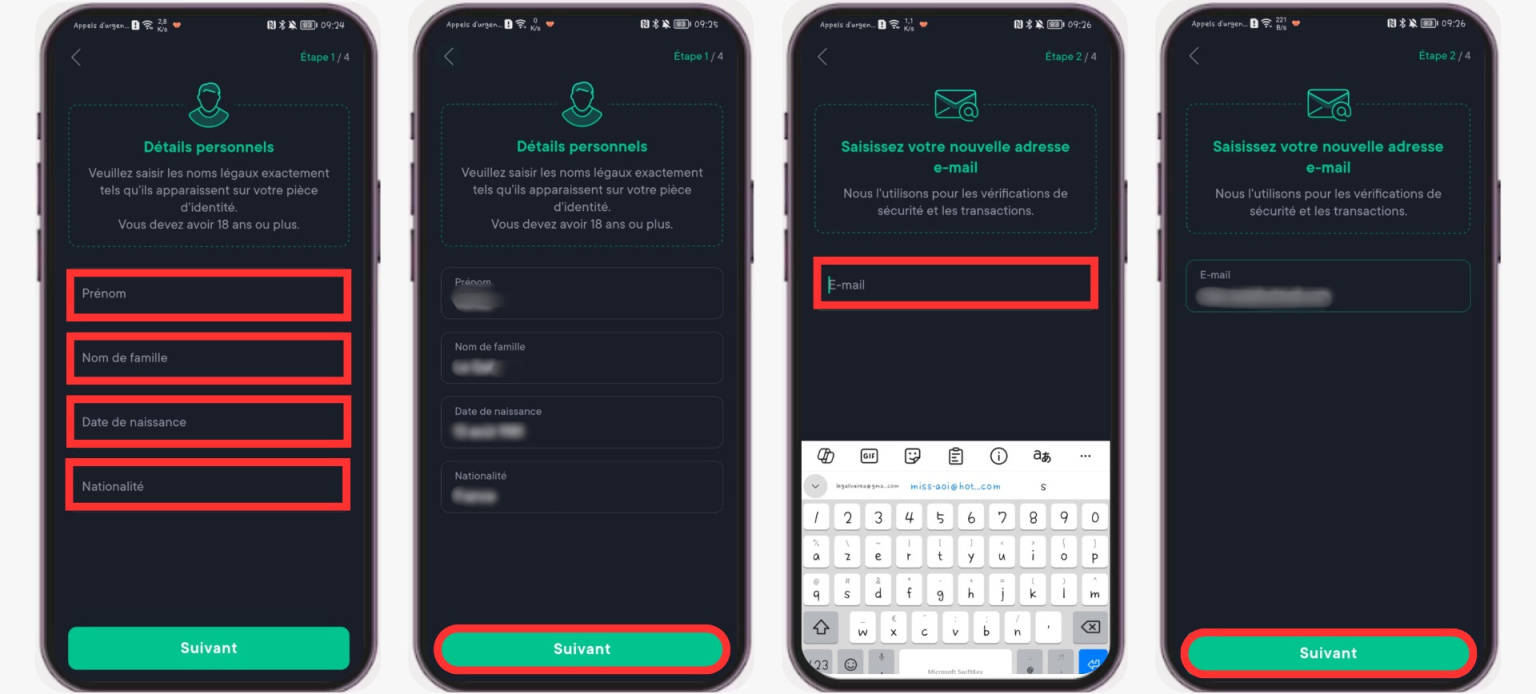 Indiquez vos données personnelles avec votre prénom, nom, date de naissance, votre nationalité et pour finir votre adresse mail.